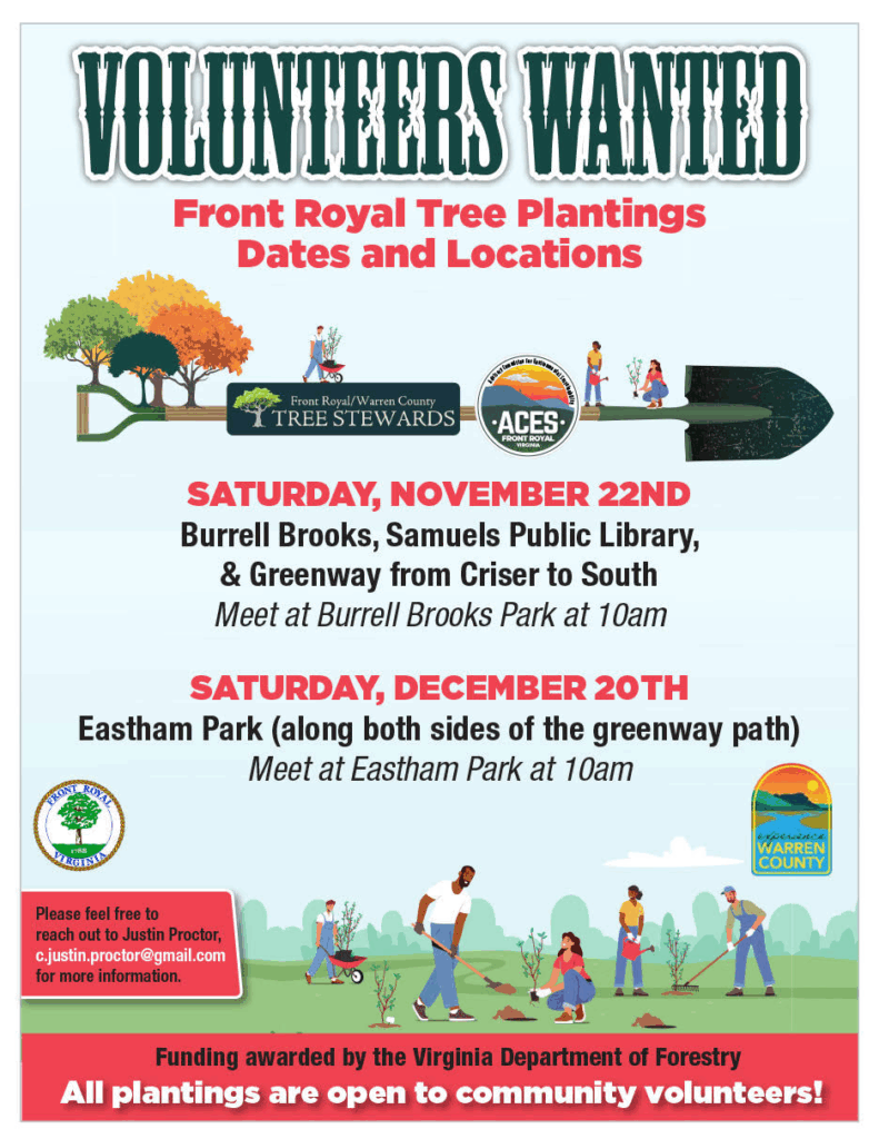 We are looking for volunteers to join with the Tree Stewards and ACES, Front Royal’s Advisory Committee for Environmental Sustainability, in two tree planting sessions in November and December.